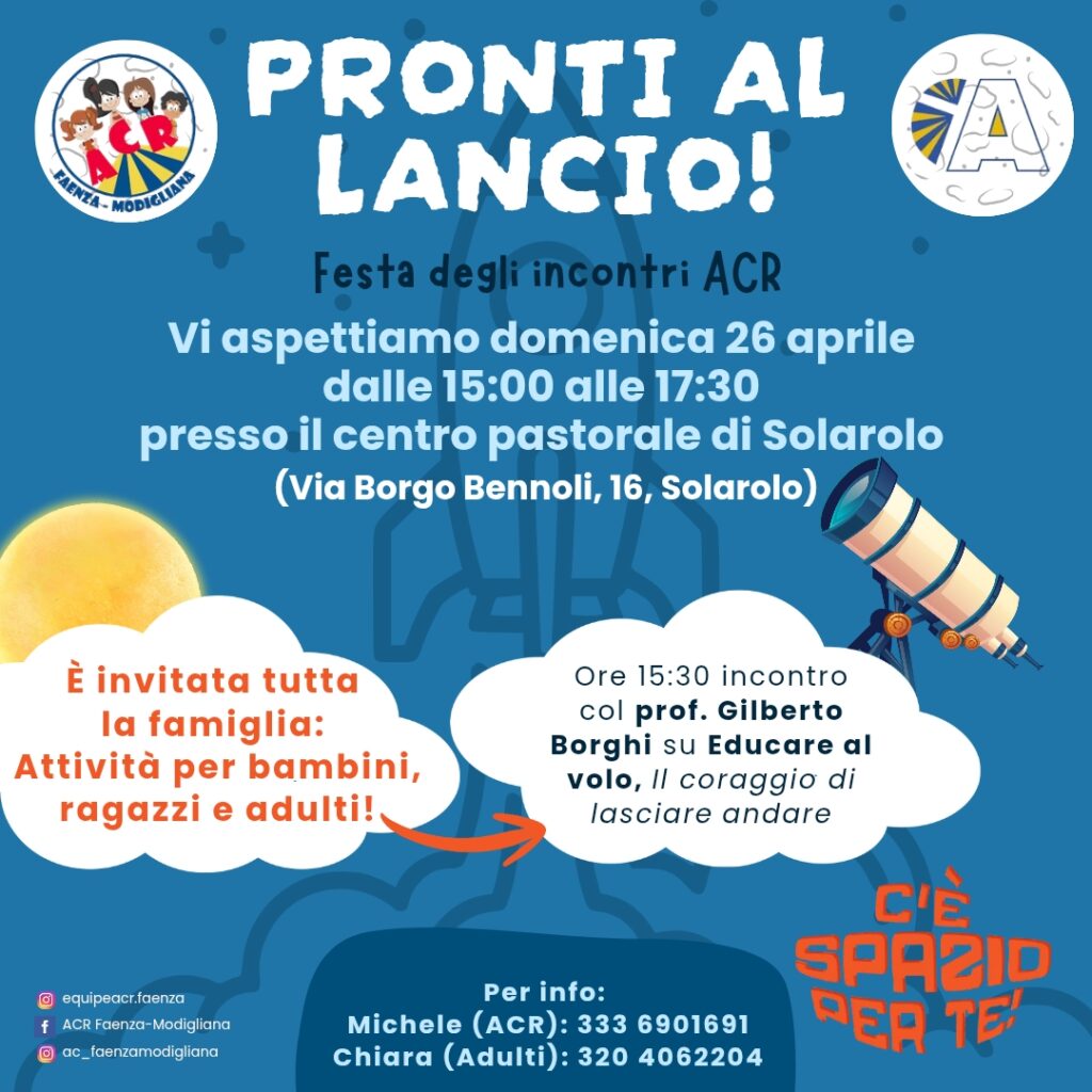 In programma giochi e attività per bambini e ragazzi e per genitori e adulti un incontro alle 15:30 con il prof. Gilberto Borghi: “Il coraggio di lasciare andare”. Dalle 15 alle 17:30 presso il centro pastorale di Solarolo.